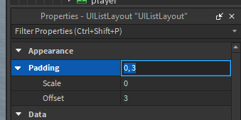 The UIPadding and UIListLayout both have very small values for their padding, but finicking with them doesn’t seem to fix anything unless I put the UIPadding bottom value high, but that doesn’t stay consistent if things are added or removed from the scrolling frame.