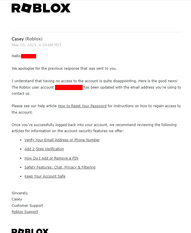 I don’t understand why Roblox would design the system to unlink your email during a password reset. At the very least, let people keep their email linked so they can actually recover the account. Right now, it just locks you out with no way back in.