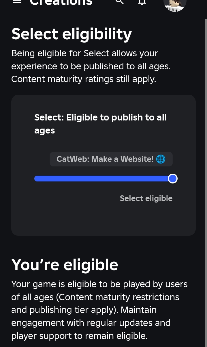 Select Elegibility shows “not elegible to publish to all ages” although the bar is full. It also said it was elegible earlier.