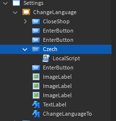 Output: ChangeLanguage is not a valid member of TextButton “Players.3DRobloxGameDev.PlayerGui.Settings.ChangeLanguage.ChangeToCzech.EnterButton”