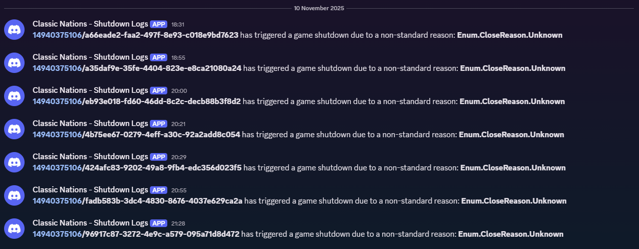 The shutdown always triggers BindToClose, and the shutdown reason is always Enum.CloseReason.Unknown. Memory usage stays well below limits (usually under 1300 MB), and it happens with as few as 2 players or as many as 32 players.