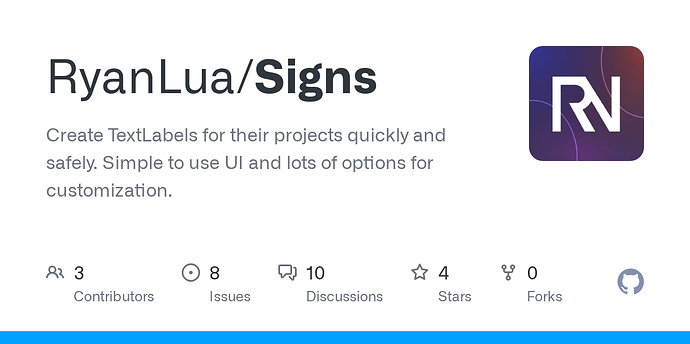 Signs is a Roblox Studio plugin that helps users create TextLabels for their projects quickly and safely. Simple to use UI and lots of options for customization.