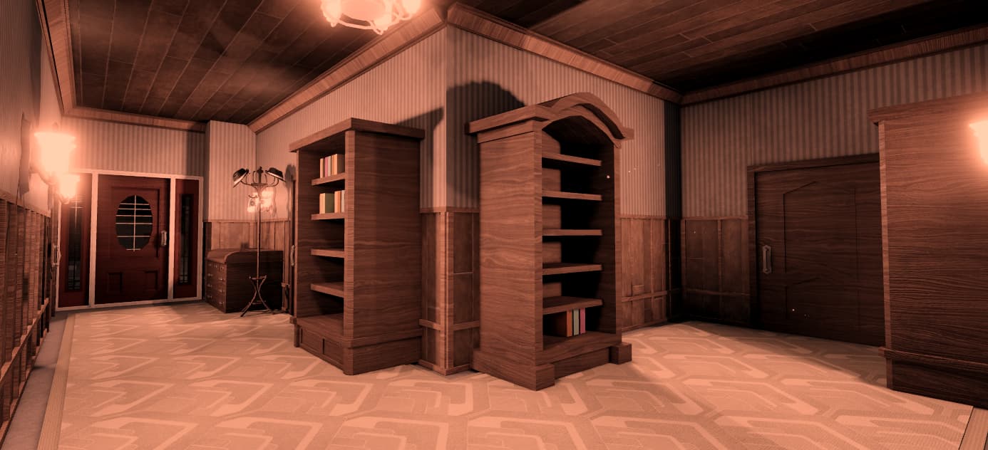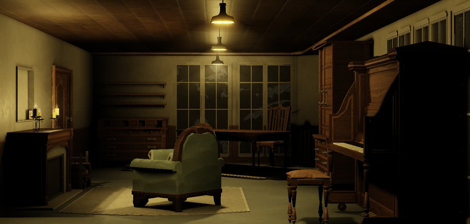 Also if the ceiling lights are on, the side of the fireplace and piano shouldn’t be in total black shadow- put some dim warm point lights in there to fake bounced lighting.