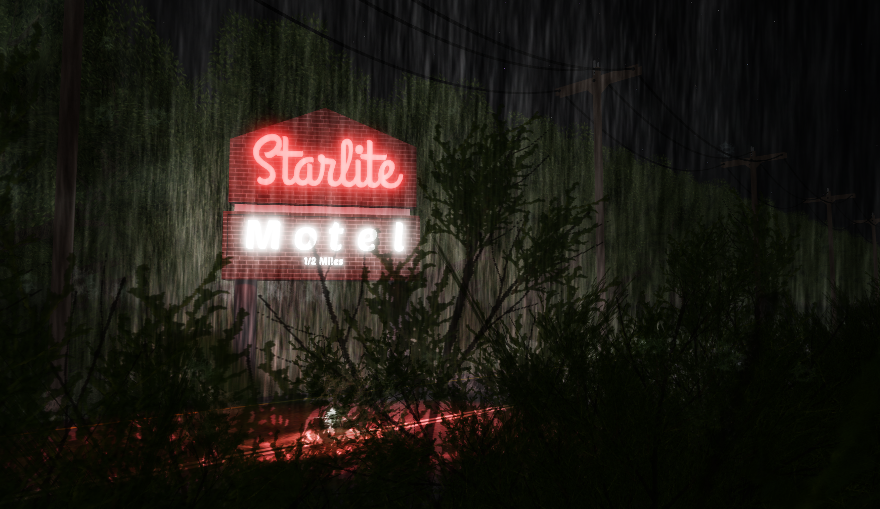 This looks very nice my only suggestion is that you lower the amount of rain falling as it is a bit difficult to see anything but the sign and trees at a glance.