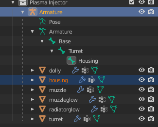 For each individual mesh, you must go through all of your Armature’s bones, and set the proper weight paint values (1 or 0 for all vertices if there are no intended mesh deformations, such as in the robot above) for each bone. Simply speaking, every single mesh must have an assigned Vertex Group and Weight Paint for the armature.
