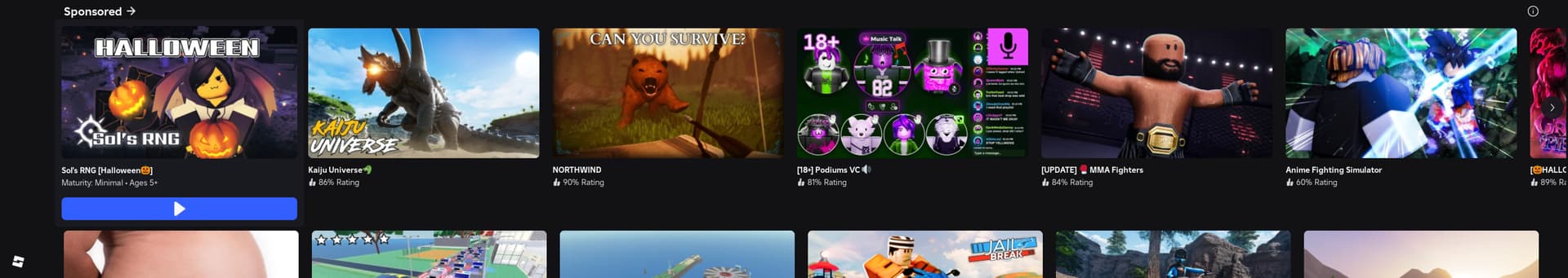 When using the Roblox Universal App, hovering your cursor over any experience within the “Sponsored” section causes the title of the “Sponsored” section to overlay the experience’s title and thumbnail visually.