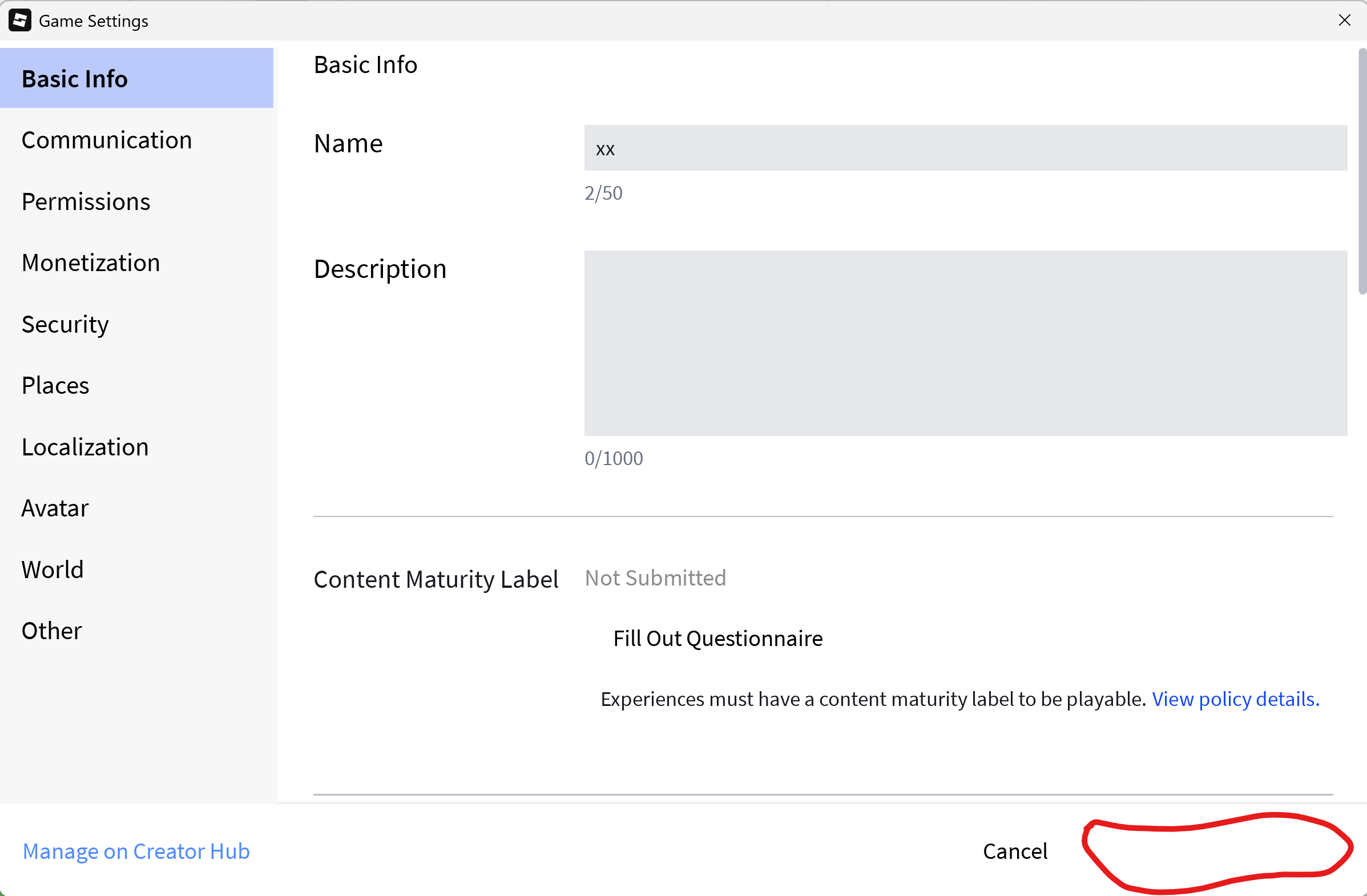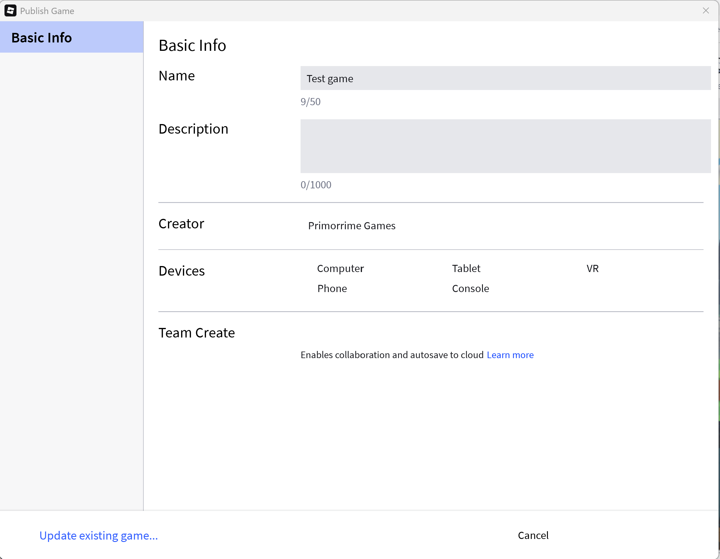 Game publishing flow (all dropdowns are invisible / not obvious, checkboxes also invisible, publish button invisible):
