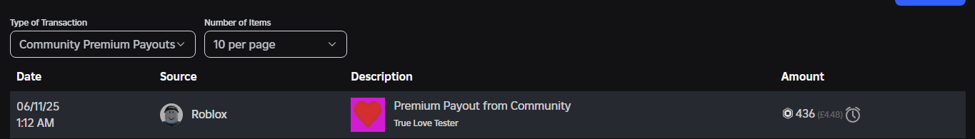 Two days ago (11 June), I randomly received a 436 Robux premium payout (it is still pending) from one of my games, True Love Tester.