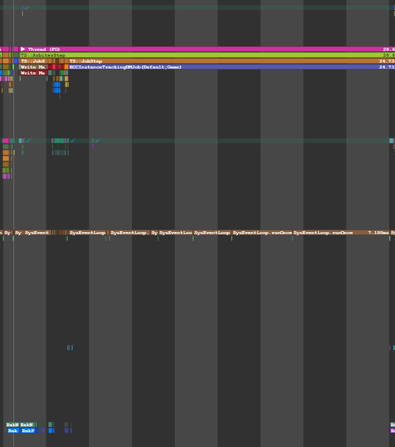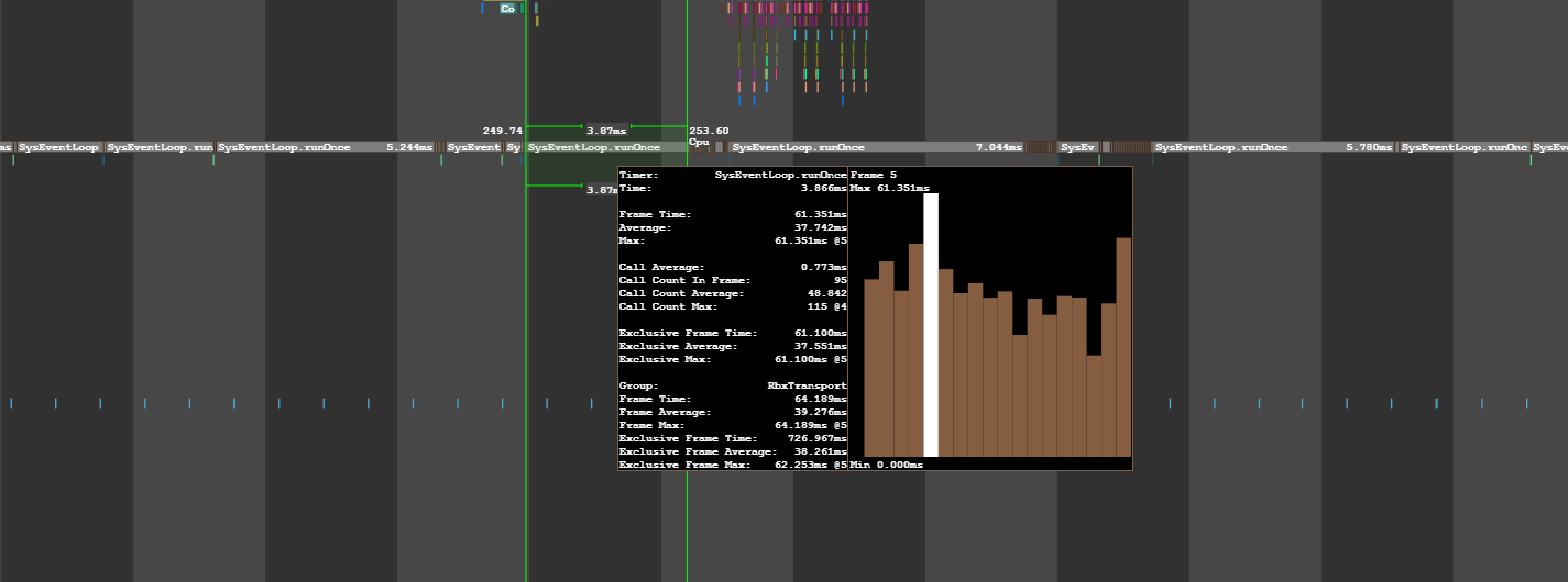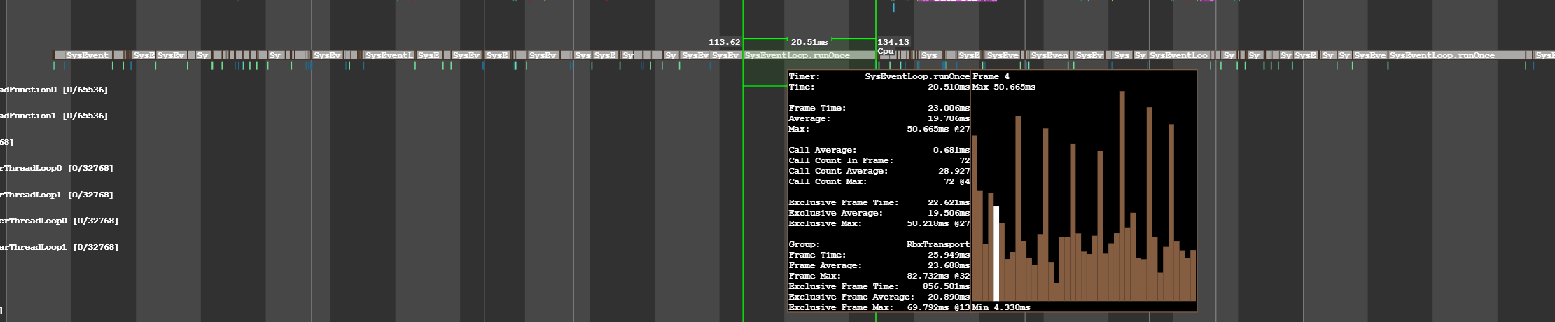 This is the biggest red flag and what lead me to search for this post. When this issue happens, we notice SysEventLoop.runOnce goes from 2ms all the way to 471ms. There seems to be direct correlation between the lag and this specific timer blowing up in frame time.