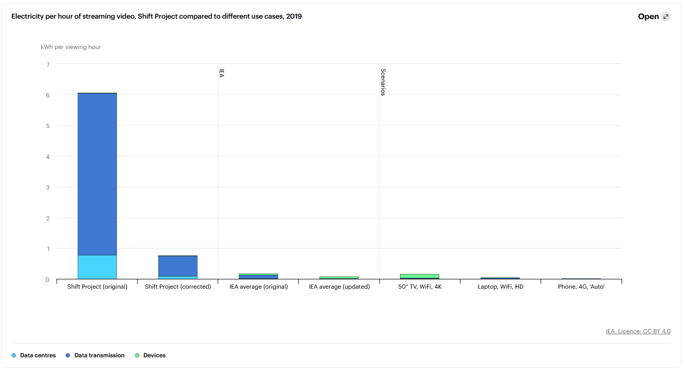Taken together, my updated analysis suggests that streaming a Netflix video in 2019 typically consumed around 0.077 kWh (77 Wh) of electricity per hour […] The results are highly sensitive to the choice of viewing device, type of network connection and resolution, as shown in the chart, below right.