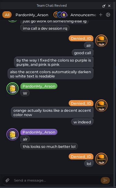 This plugin is a modernized implementation of the now deprecated Team Chat intended to revive and improve upon it with various custom features such as typing indicators, markdown support, notifications with sound, attachments (images, audio, and instances), group chats, a ton of customizability in the settings, and everything previously in the original Team Chat, along with its layout.