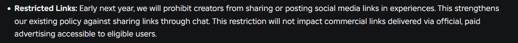 Currently, youâre allowed to link to a few specific websites in-game, as long as you use PolicyService to block ineligible users from seeing the links. Roblox just announced that theyâre completely killing that. Great.