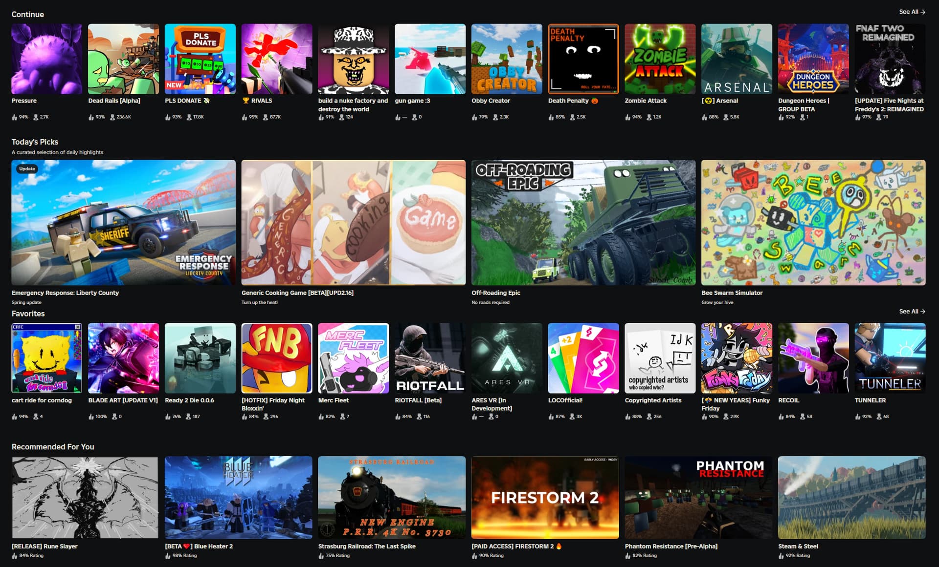 Today’s Picks is already a category that Roblox chooses, this banner is something Roblox chooses, the sponsored category that’s under the continue one is something fixed Roblox displays and these are the biggest tiles on the page, overshadowing the poor favourites category (on the bottom of the page) and the continue category (sandwiched between the other ones).