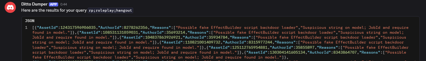 This project takes a little bit of inspiration from things such as anti-backdoor plugins, mainly things like the classic Ro-Defender, which is simply a bunch of string.match on common backdoor items and then reporting them to the user, but instead of doing such on demand, I decided to build a small program to do it all from simple Toolbox API queries, all compressed into a simple Discord Bot for easier consumption.