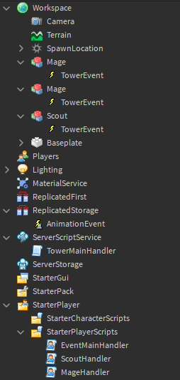 EDIT: After thinking about this, something like this would be redundant. I’d put RemoteEvents under each tower. AnimationEvent as well as EventMainHandler would be redundant. Each tower handler (e.x.: ScoutHandler) will listen to the events of each placed tower (which you can do by utilizing CollectionService and adding a listener to each tower), and when an event is fired, it will play the appropriate animation. This would look something like this: