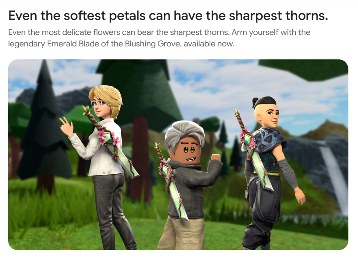 I recently noticed over the past weekend that google play has shown a promotional post on the roblox app for an item called Emerald Blade of the Blushing Grove but when I went to search for it I could not find it. I would expect this to be put on the catalog so that people can buy or know how to obtain it