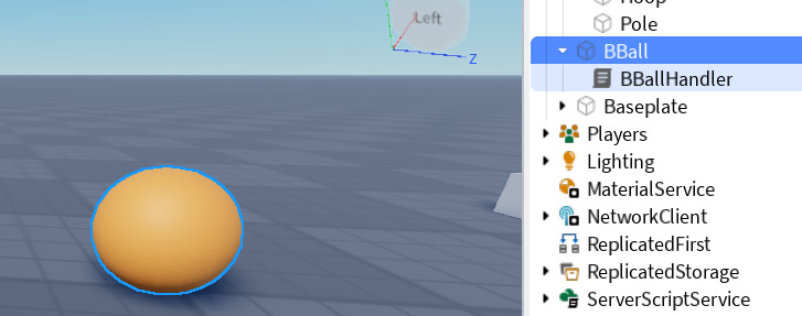 Earlier we decided that we needed a local script to handle input, and we worked out a small program that will fire a RemoteEvent when we press ‘E.’ However, while the signal is sent, nothing in our game actually cares about that signal. This is where local remoteEvent = ReplicatedStorage.RemoteEvent definied in BBallHandler comes into play. We’ll use the OnServerEvent function to execute a function when we call FireServer() from our local script.