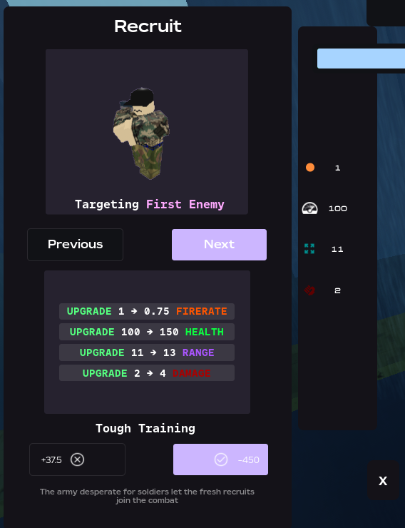So, we got to work, and started to plan some towers out. First we made starter towers, Recruit and Grunt. Those are your standard towers with a pistol and a rifle respectively. Then, we planned out a bunch more towers, like a DPS tower, Support tower, blah blah blah. I am not going to describe any of these towers for now, as they are pretty generic.