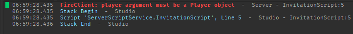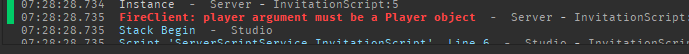 When you fire the server from the client, the player is already sent as the first parameter. Basically the parameters that the server received is (player, player, playerToInvite). When it got to the server, you defined the second “player” to “InvitedPlayer”. Just replace this line in script 1.