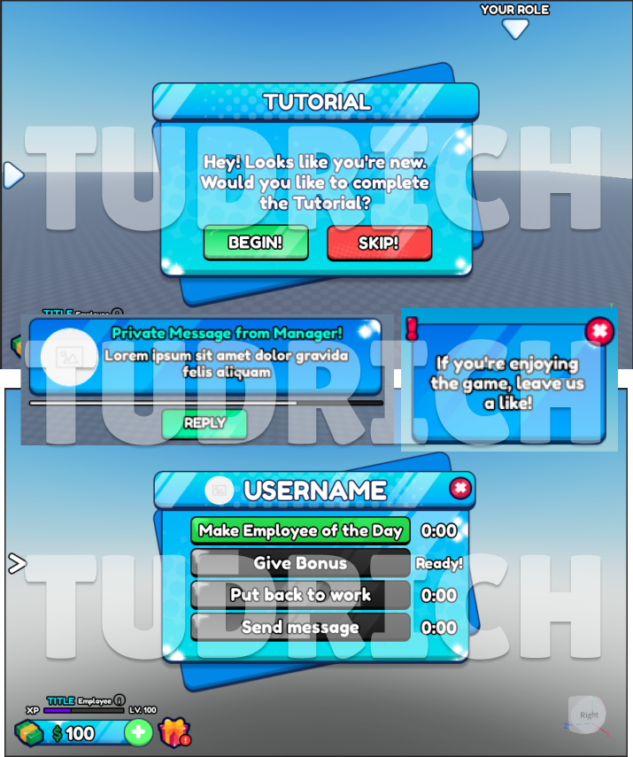 Hello! I’m TudrichDev, a 16-year-old Roblox User Interface Designer with over a year of experience creating intuitive and engaging UI designs for Roblox games. I specialize in crafting visually stunning, functional interfaces that enhance player experiences and align perfectly with each game’s unique style. I DO NOT MAKE ICONS!