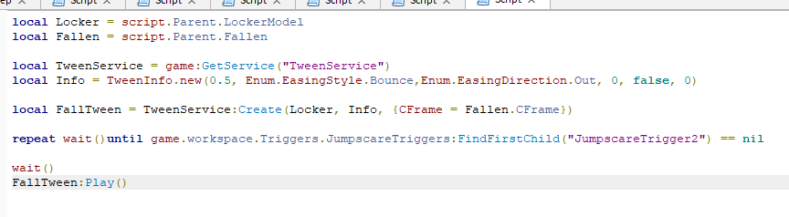 I think that was a mistake on my part I just switched “JumpscareTrigger2” with TriggerJumpscare 2 and now the “Locker” stays still when I start the game and doesnt trigger on touch of the trigger part