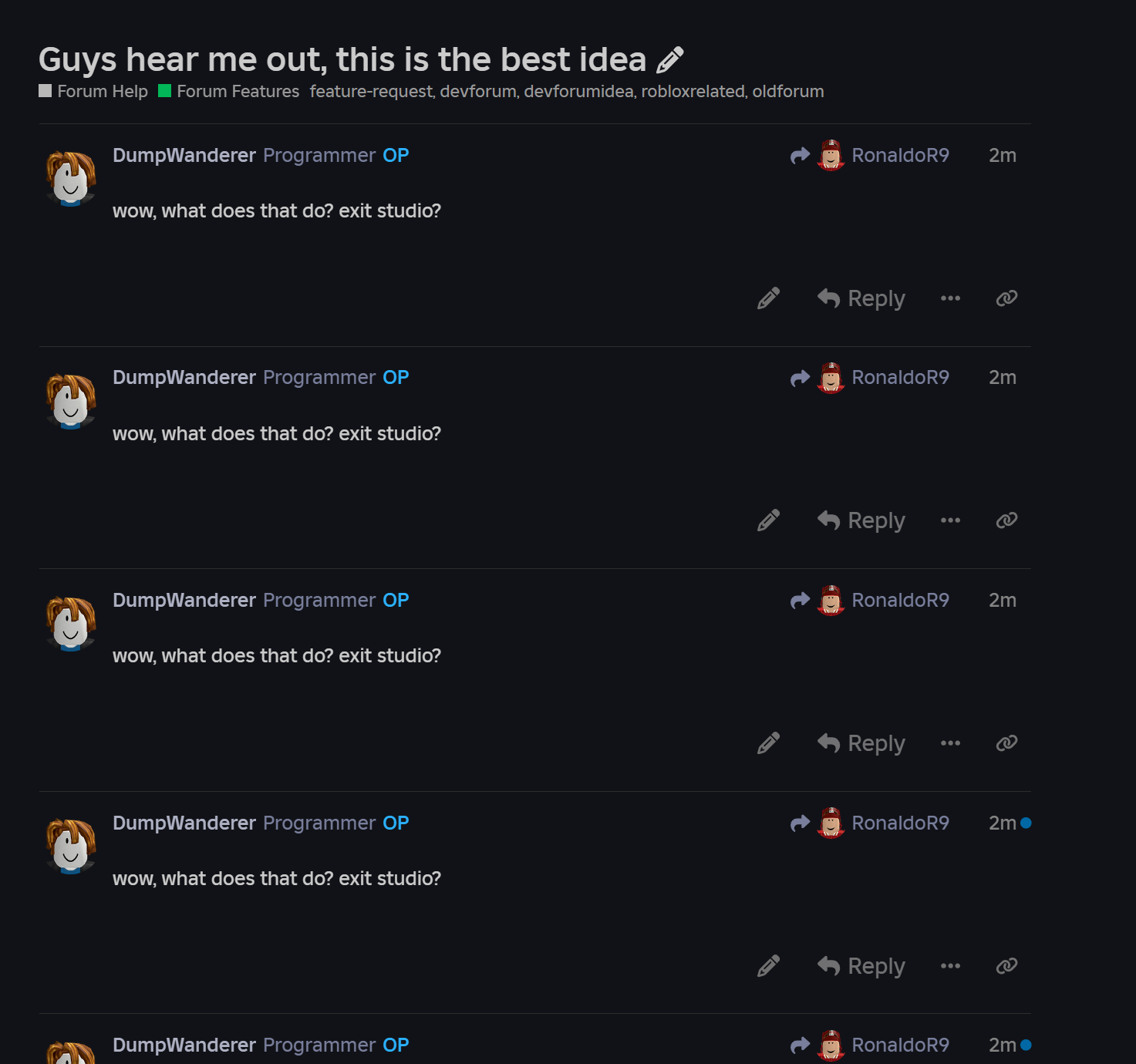 I was on a forum post which had things such as “wow, what does that do? exit studio?”, then I checked my notifications and from there I went to another post called “Guys hear me out, this is the best idea”