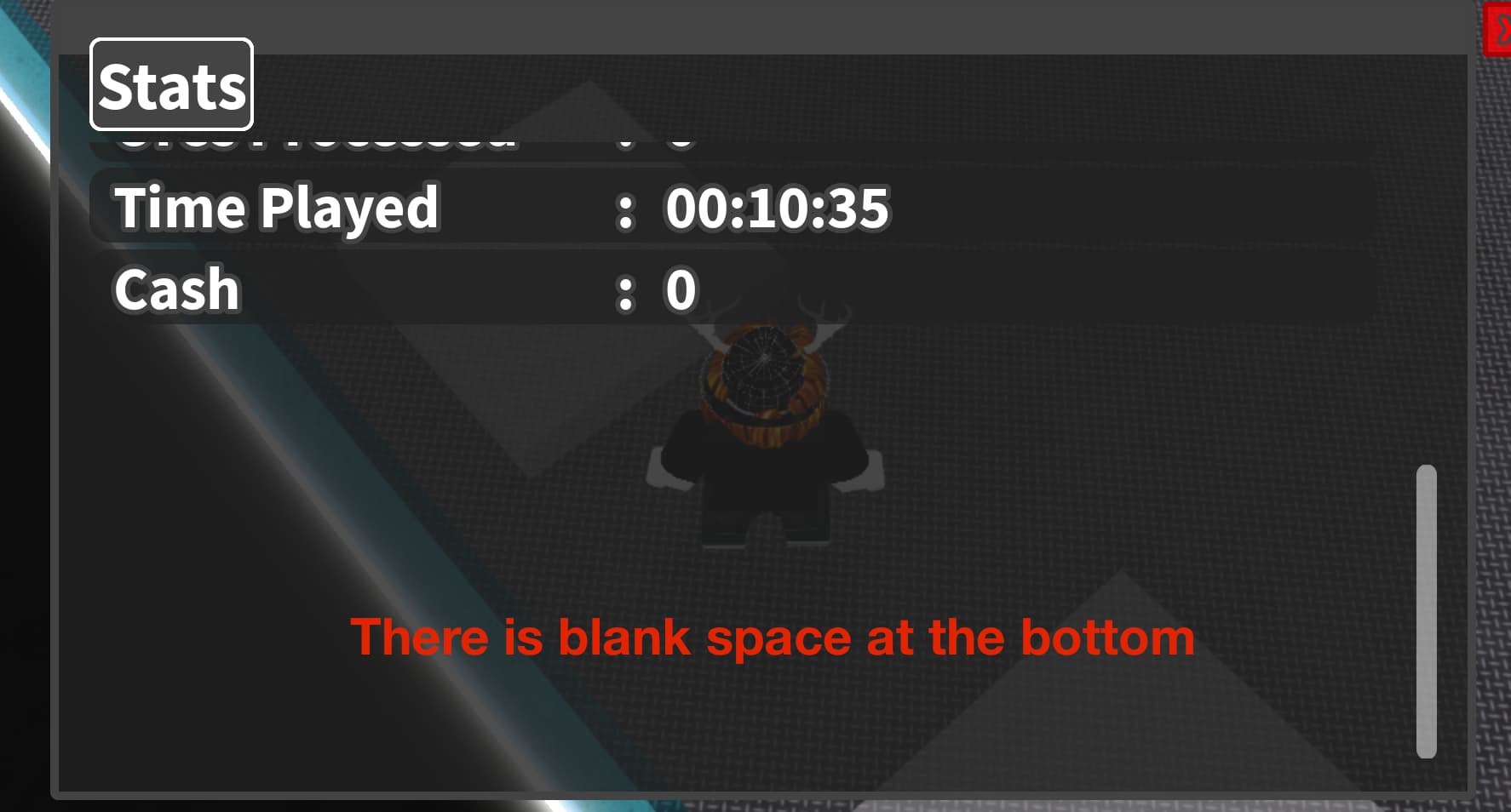 TextLabel.TextScaled = true: I don’t like how the tutorial’s TextLabel is scaled because as more text is added, the text gets smaller. I’d suggested you have TextScaled set to false and instead have the TextSize beTextLabel.AbsoluteSize.Y / 5(also make sure to adjust it when the absolute size changes). - ScrollingFrames CanvasSize too long/short. This is an issue in so many games. I don’t know why many people still struggle with this. More info here (outdated)