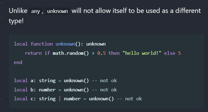 Hmm. That’s true apparently. I also tested it, and it indeed does not show nil. I’ll reconsider the approach. If unknown is the top of all types, what is the difference between any and unknown?