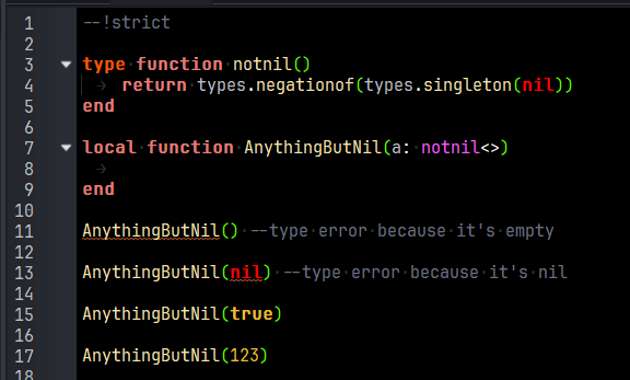while luau doesn’t support strict “exclude nil” type annotations like some other languages, you can achieve this behavior with runtime validation. you’ll need to manually check for “nil” where necessary in your functions and filters.