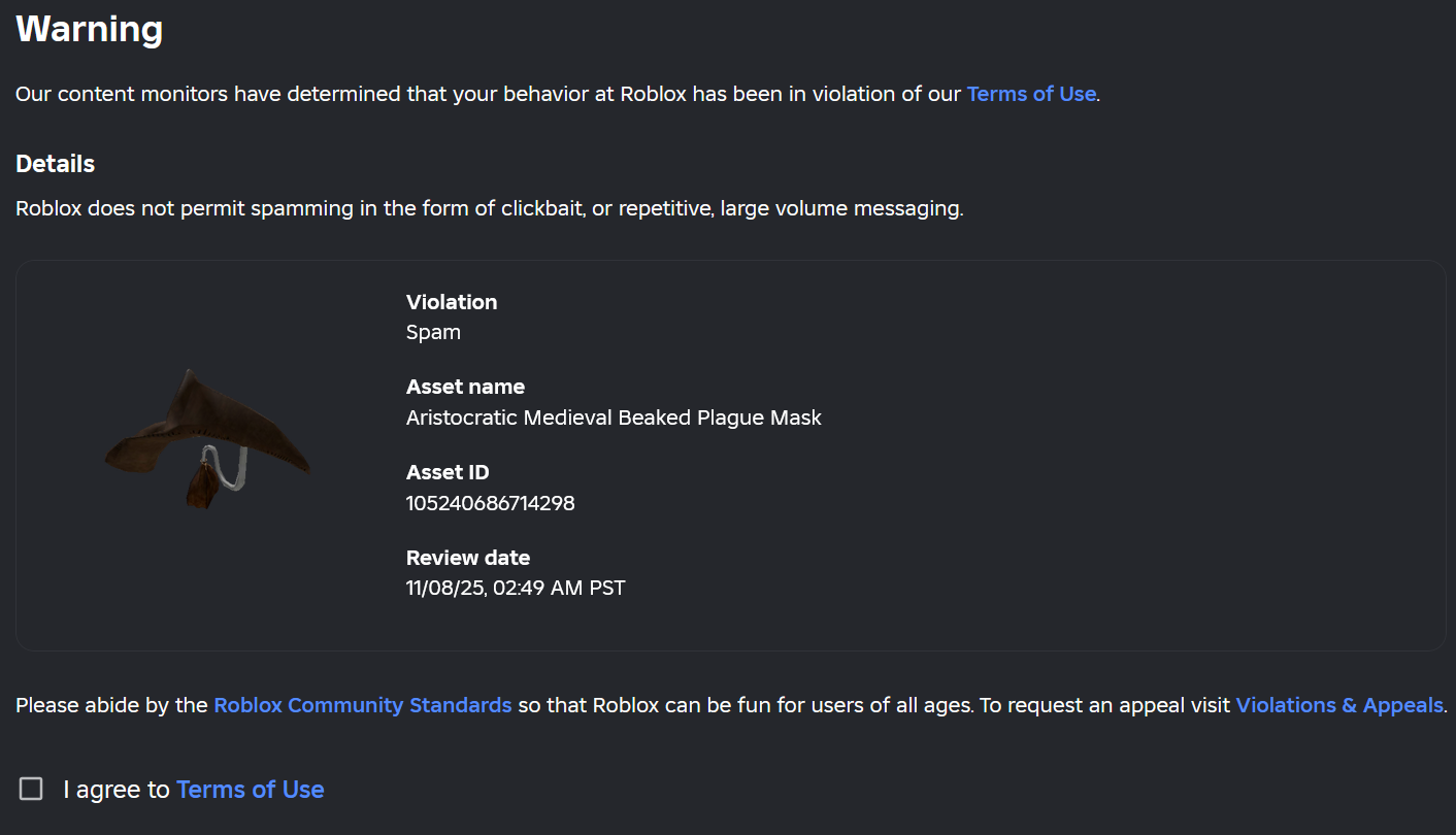 I paid the 750 robux fee to upload a plague doctor mask and was instantly met with a warning and removal.