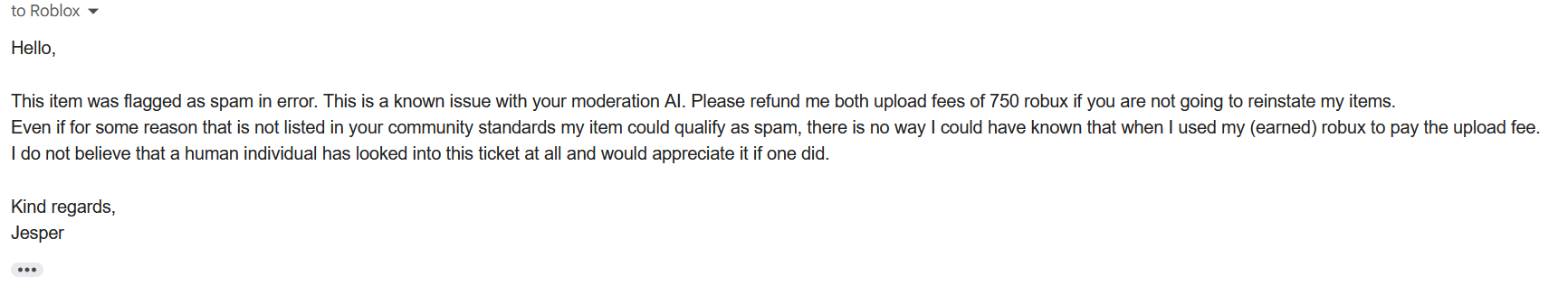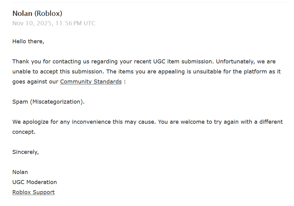 This is a known issue that has been talked about a few times on the devforum, but is still happening. What I can only assume to be AI moderation will falsely detect unique, non-spam and non-miscategorized UGC uploads as spam within seconds and remove them without refund or explanation.