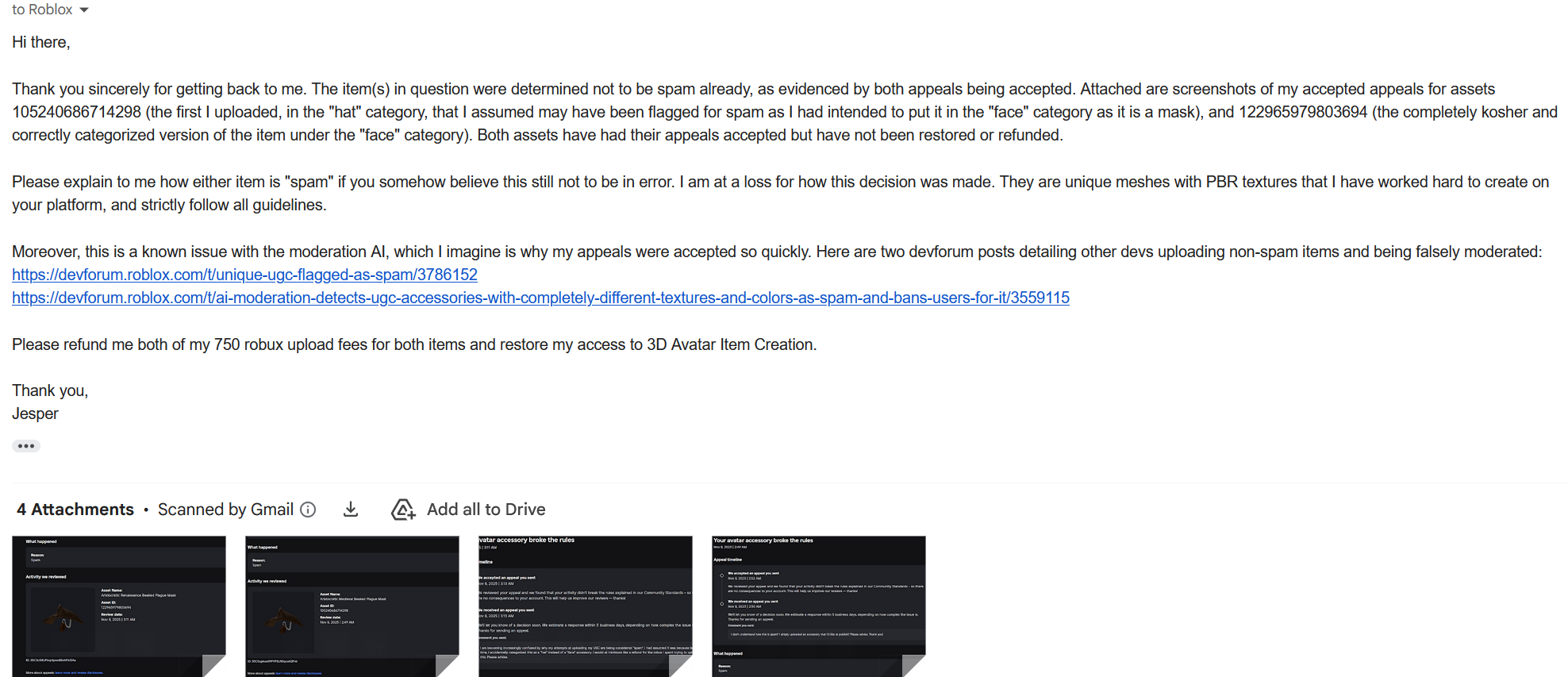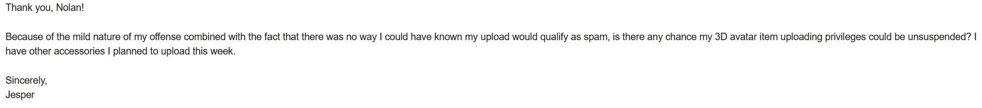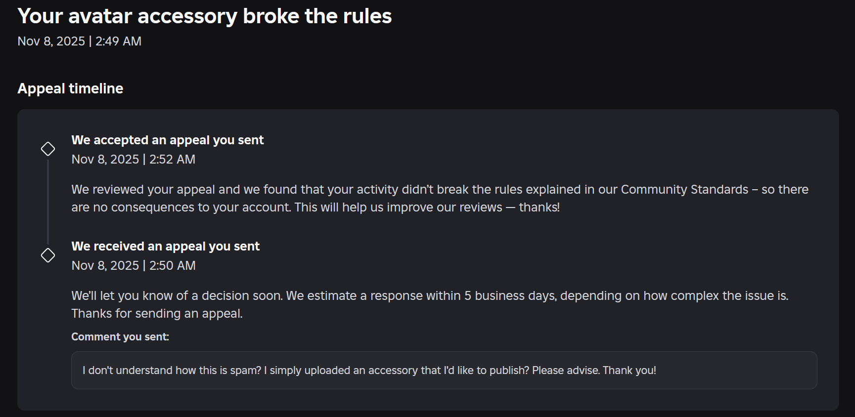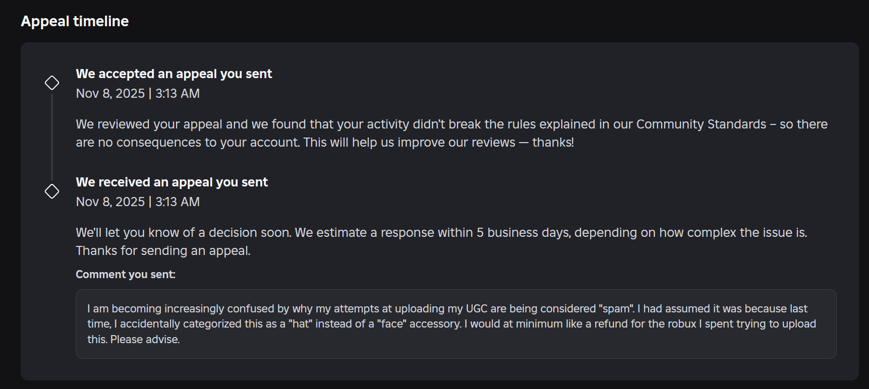While waiting for a refund or the item to be reinstated, I started to think listing the item as a hat instead of a face accessory may have been contributing to it being unapproved and thus remaining deleted. Foolishly assuming a refund would go through for me soon because my appeal had been accepted, even if the item wasn’t coming back, I decided to reupload this item with different scaling under the face accessory category instead of as a hat.