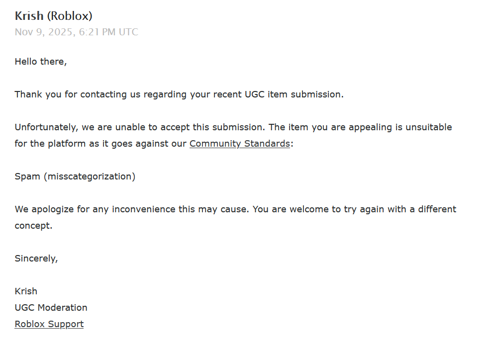 Even if somehow not an error, I would appreciate it if support communicated with developers why and how we’ve broken the rules so that we can be sure not to waste our effort and money creating assets and paying fees that are wasted.