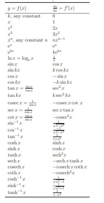 Because it is really time consuming to use the formula above every time we need to find the derivative of a function, there are luckily for us some formulas which we can use. An example of these is given in the following image: