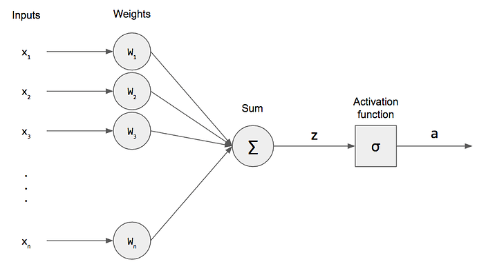 We multiple each input (let’s say x1) with its corresponding weight (the w1) and sum all the multiplied values.