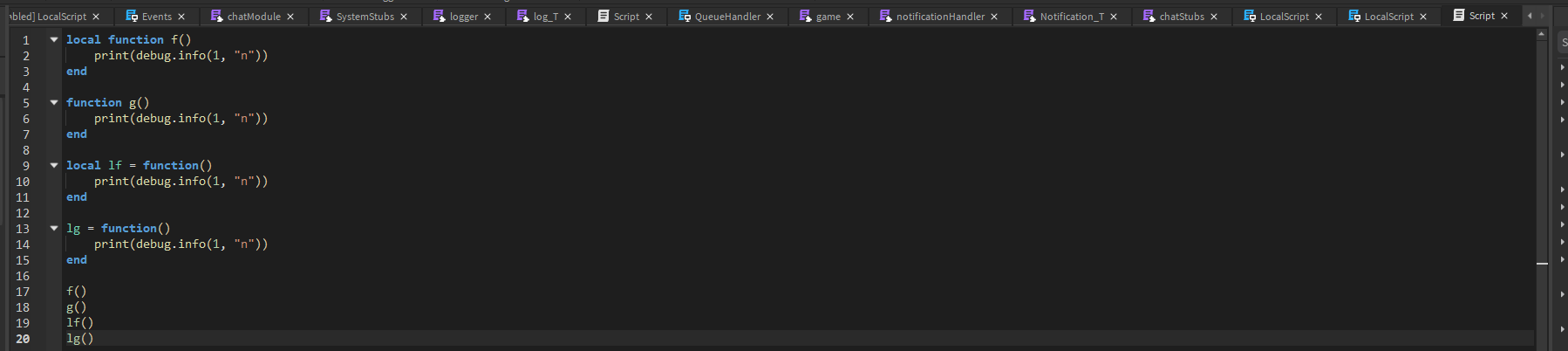 Because Luau is derived from Lua 5.1, in which this rule still applied, these should function the same way - whether it be debug.info(1, “n”), calling the function, and everything in between.