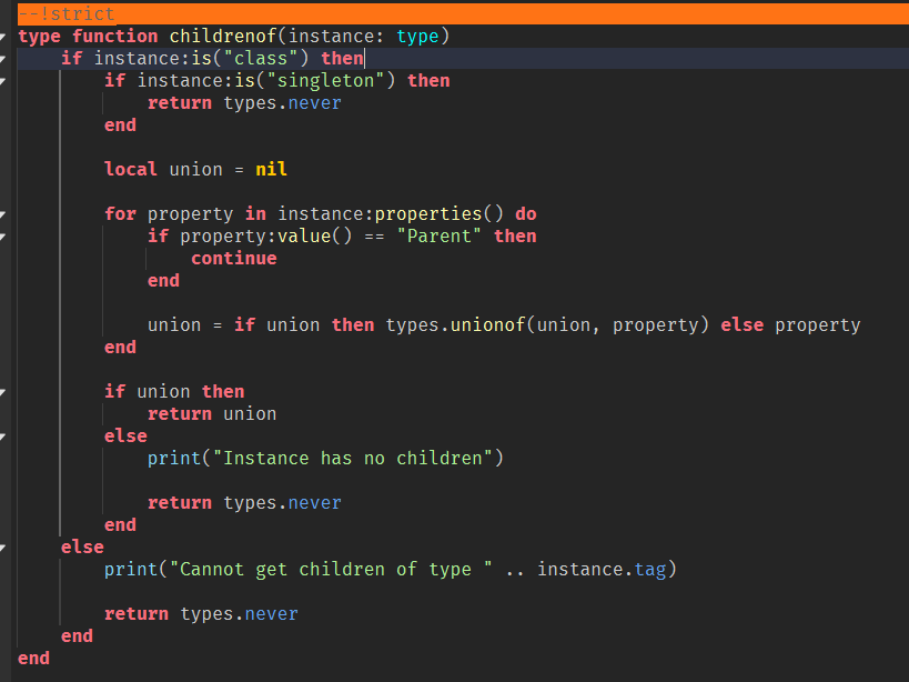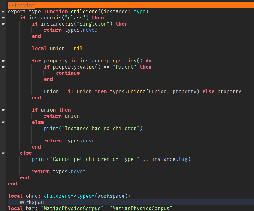 Take this simple childrenof type function for example, which should be a near-equivalent to the keyof function, expect it creates an union of the instance’s children names.