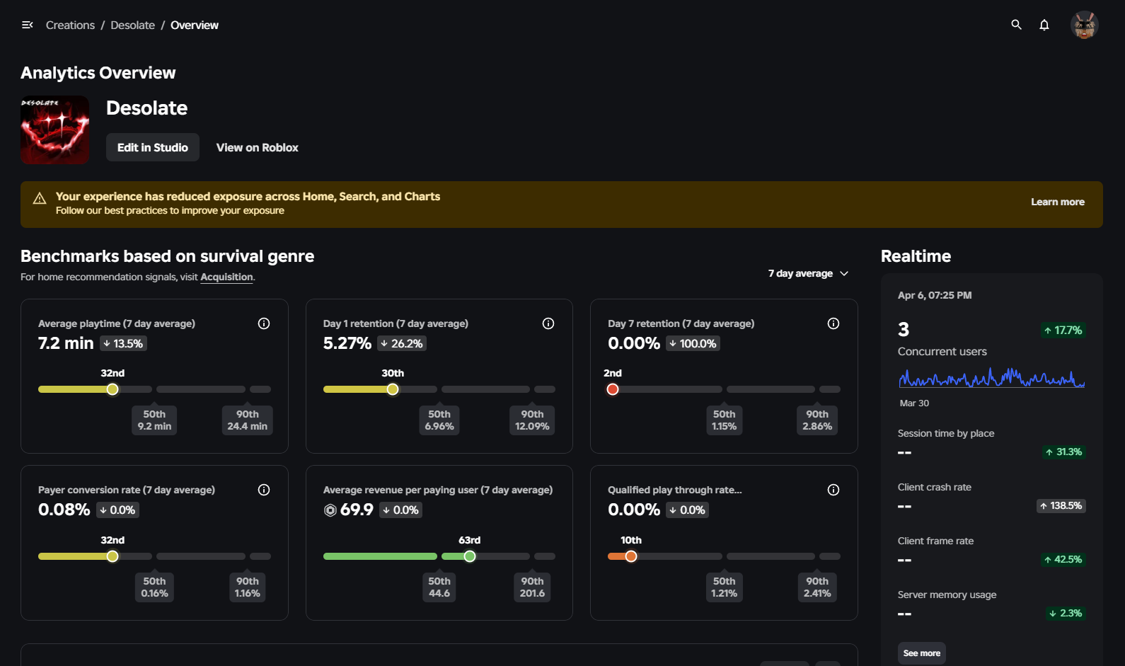 My experience was suddenly marked with the notice “Your experience has reduced exposure across Home, Search, and Charts”, which immediately caused a major drop in CCU.