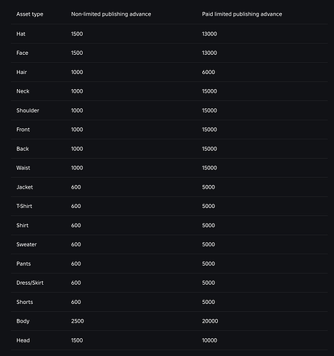 We are updating publishing advances to more accurately reflect creator earnings for each category. Practically, this means creators will see publishing advances in most categories go down. A publishing advance is a refundable upfront fee paid to publish an item on Marketplace that is then recouped as the item is sold. Roblox does not take a platform fee until the publishing advance has been recouped.