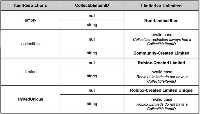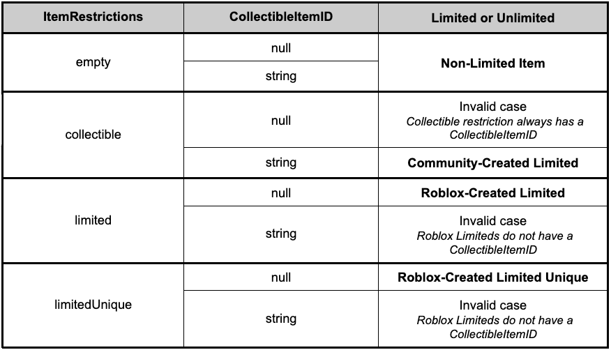 There is another field named CollectibleItemID. This field is only set if an item is a “collectible”. Today, only community-created Limiteds are “collectibles”. After our changes on March 18, non-Limiteds could also be “collectibles”. If you are using the CollectibleItemID field to determine if an asset is a community-created Limited, your logic will no longer be accurate.