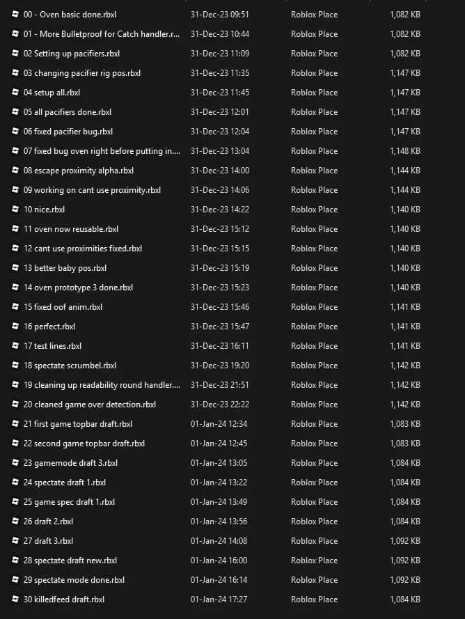 Because Version History doesn’t support any kind of organization, I’ve had to build my own manual backup system. I save .rbxl files locally, name them by hand, and organize them into folders myself.