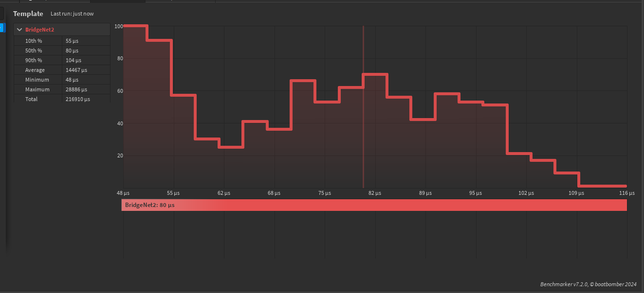 (*Important Note: These benchmark are using the latest version and are using reliable event, the lower number is better, 250 iteration per attempt (total ~251 attempts per run), Specially for "BridgeNet2" here, it run separated because it always appearing bunch of errors and a bit lagging while on benchmark, which this affects to the benchmark results and "BridgeNet2" keep failing on this benchmark where it give result of 0 total packets received to bridge-event server listener.)