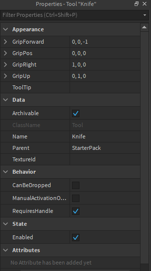 For some reason, the tool doesn’t equip even though the Main Part name is “Handle” and the Properties are just the default one.