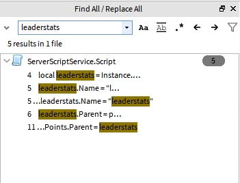 Press CTRL+SHIFT+F and search for “leaderstats”. You should see a menu like this: