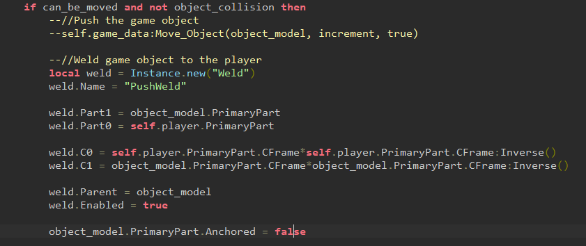 Hi, so for my game I was trying to improve object movement mechanics by making it smoother, versus using CFrame to move the objects which creates a choppy effect. One idea I had was to use welds, to attach game objects to the player so when the player moves, the object also moves, and it’s buttery smooth.
