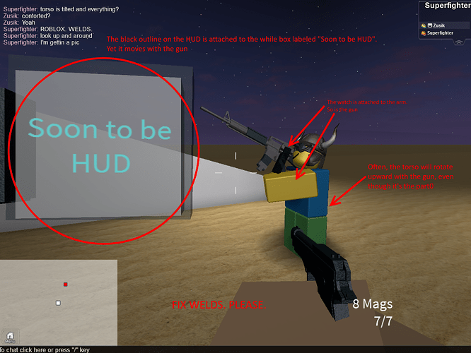 For a while now, welds have had some… annoying behavior. Contact | Alpha - Roblox Go here and try out the animations, Often, the welds will get stuck. As well, I have seen things where reloading when the gun was attached to the torso would, at least visually, rotate the entire torso into weird angles. Please fix these weird behaviors?