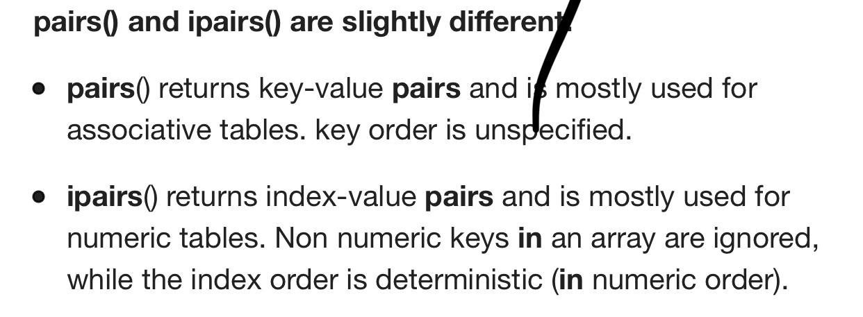 ipairs is used for iterating a tables that aren’t dictionaries, which is an array. pairs is used for dictionaries. There’s a lot of tutorials out there explaining this already.