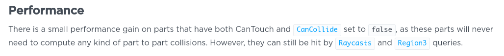 so if your leaving parts in your workspace with CanTouch and CanCollide turned on your losing performance all the time but that does not make us go and turn CanTouch and CanCollide off for everything