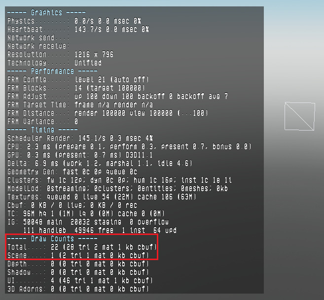 Someone told me they noticed that having many trails was significantly less performance impactful than having many beams. I was confused by this because I thought that a trail and beam segment were both only 2 triangles. Yet, when testing the draw counts for a trail and beam segment, it appears a trail segment somehow only has 1 triangle despite the wireframe clearly showing 2.