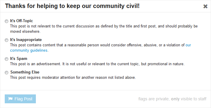 Discourse’s flagging is a bit different though – it’s mostly automatic. When enough users flag a post for the same offense (by default it’s 3, but ROBLOX might modify that) it’s automatically hidden from the discussion. Whether it be a weekend, 4 AM, or if ROBLOX’s entire staff took a year-long vacation, once a post gets 3 identical flags from different users, it’s hidden. This will enable us to quickly kill posts that could quickly derail threads.